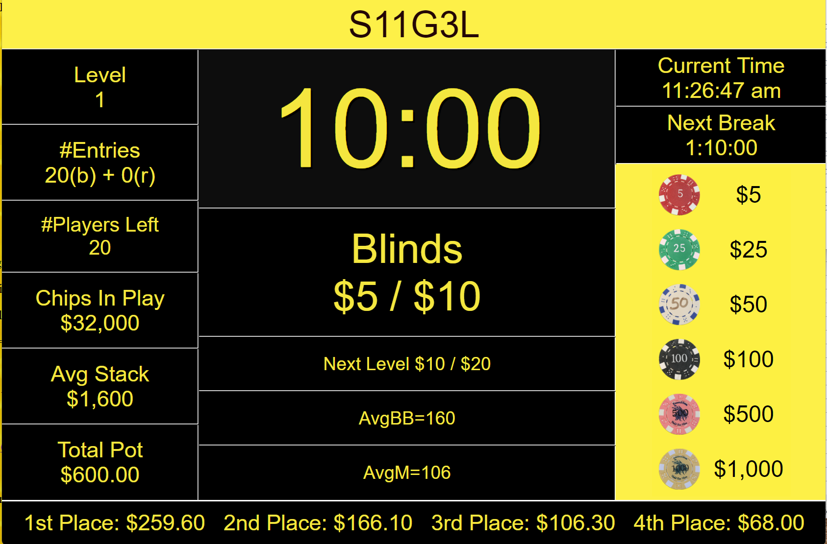 2. $30 buy in, rebuys allowed for first 70 minutes (limited to 22 total buyins per game)